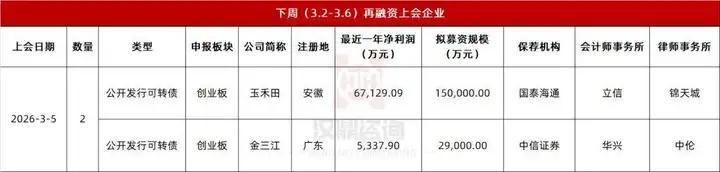据交易所官网审核动态信息,下周(3.2-3.6)IPO上会审核8家企业,合计拟募资129.04亿元。