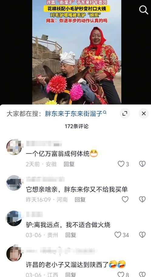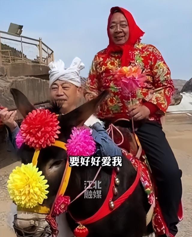 他穿着花衣裳、戴上红头巾,骑在毛驴上,还 “娇俏” 地让工作人员照顾好自己。